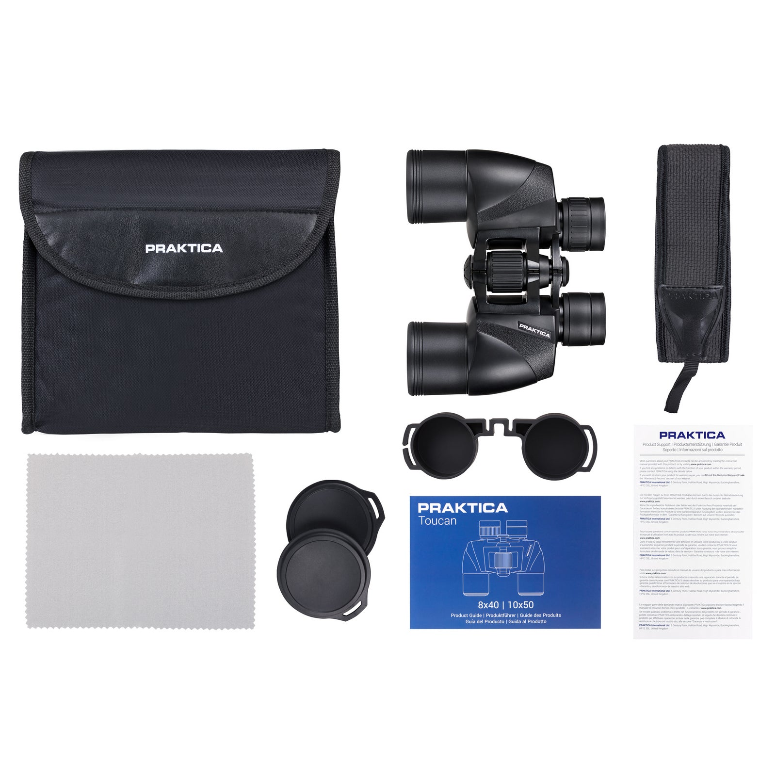 Бінокль Praktica Toucan 8x40. Незважаючи на популярність компактніших біноклів із призмами Roof, існує чимало цінителів хорошої оптики з класичним призмінним компонуванням Porro, що дозволяє досягти більш об'ємного і чіткого зображення. Саме для таких користувачів створено лінійку біноклів Praktica Toucan з найбільш популярним співвідношенням збільшення та апертури. У цій серії використані всі оптичні компоненти, необхідні для створення зображення високої якості. Це призми з баритового крона BAK4, і багатошарове просвітлення кожної оптичної поверхні лінз і ширококутні окуляри великого діаметру, що створюють значний комфорт спостережень. Це універсальні моделі для полювання, спостережень за живою природою, ландшафтами та міськими пам'ятками.