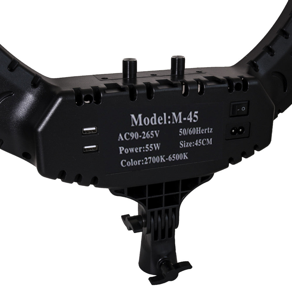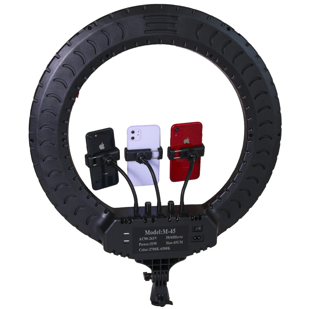 Лампа LED "RL-18" забезпечує рівномірне світло без мерехтіння. Діметр кільця 46 см цього достатньо, щоб рівномірно висвітлити всі необхідні об'єкти. Лампа працює від мережі 220 В. Під час тривалої роботи не нагрівається. Є можливість закріпити одразу 3 смартфони для зйомки. Лампа підійде для салонів краси, фотографів, блогерів. У комплект входить: лампа, пульт керування, шнур живлення, тримачі смартфона.