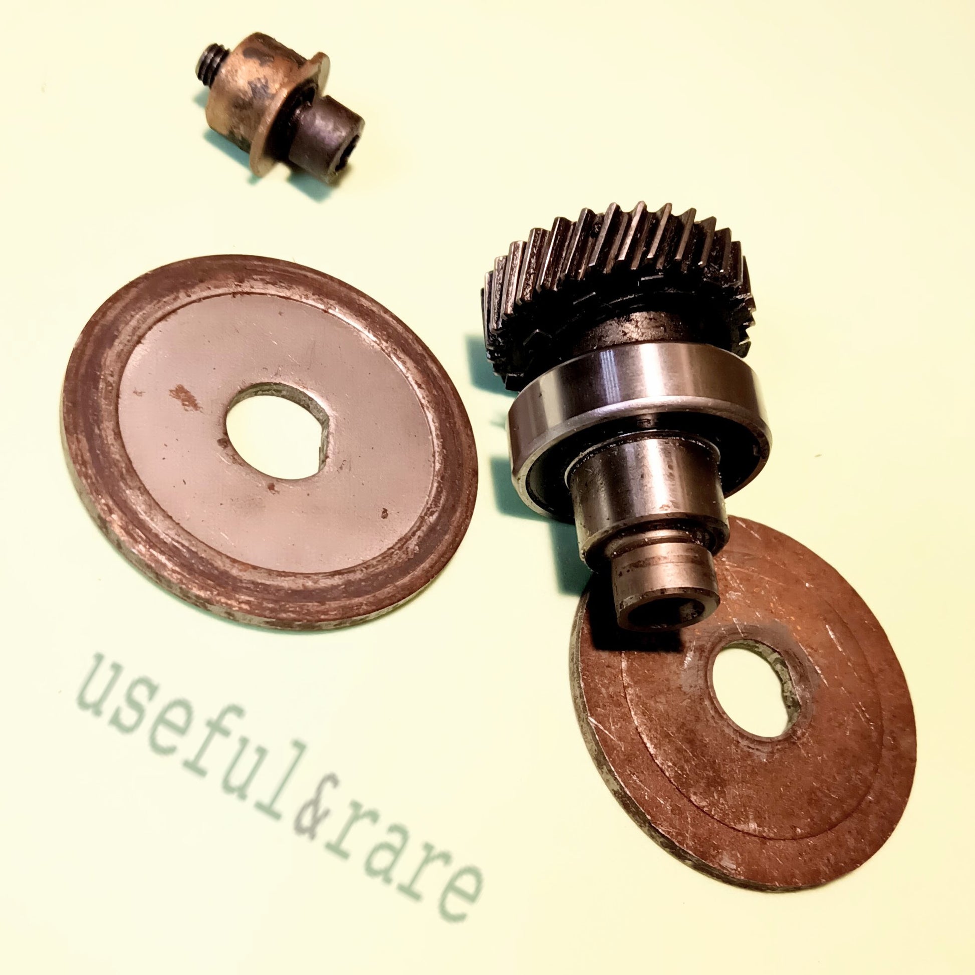 Вузол редуктора циркулярної електропили. Довжина валу 56 мм, місце підшипника 6 мм, діаметр шестерні 35, зубів 31, діаметр підшипника 32 мм, діаметр притискних фланців 50 мм