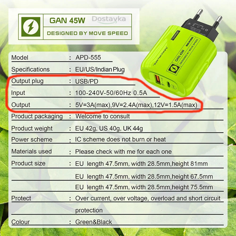 45W USB C GaN Quick Charging Wall Adapter USB PD 25W QC3.0 Travel Charger Plug для девайсів iPhone 15 Xiaomi Samsung Huawei